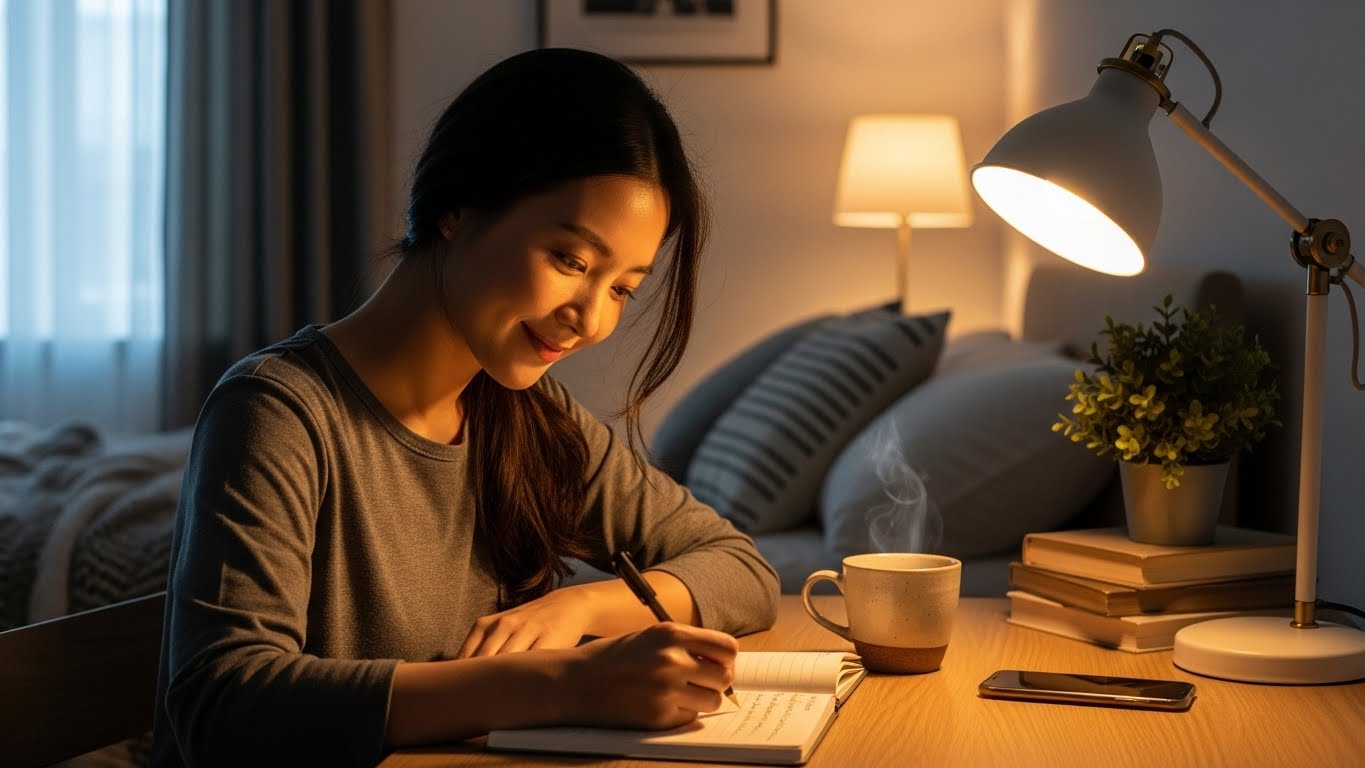 - 10분 감사 일기: 스마트폰 메모장보다는 손으로 직접 쓰는 것이 뇌에 더 깊게 각인됩니다. 오늘 있었던 감사한 일 3가지를 천천히 적어보세요.